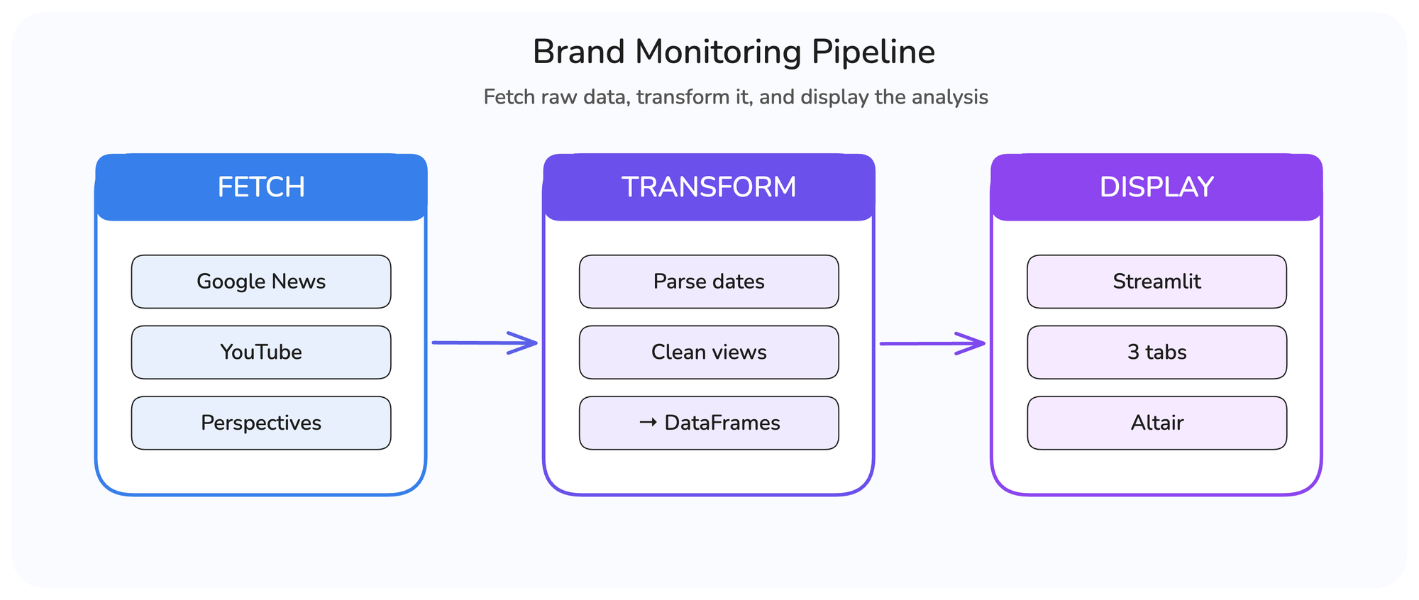 The difference this time is three separate engines running in parallel. Each returns a different response structure, so the transform step normalizes everything into DataFrames before the dashboard consumes it.