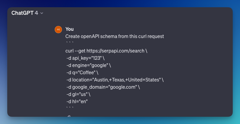 You can learn and build it yourself, or if you're lazy like me, ask chatGPT to build it for you. I'm copy-pasting the sample curl request from the API documentation.