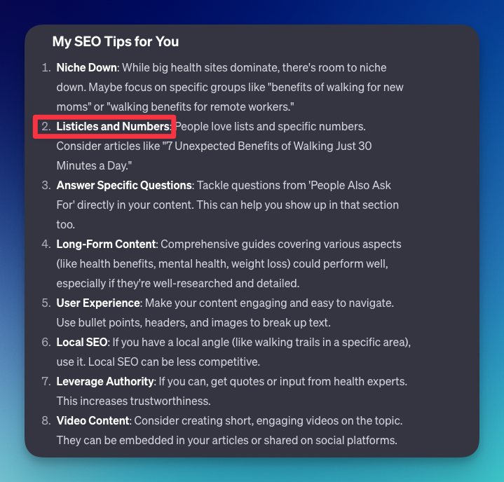 You can adjust our GPT by interacting in the chat box or from the configure tab. For example, you can ask the GPT to return 5 article ideas for you instead of only returning SEO tips.
