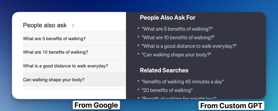 Besides the accurate top-ranking results, our custom GPT reflects the actual "people also search" content from the Google Live results page.