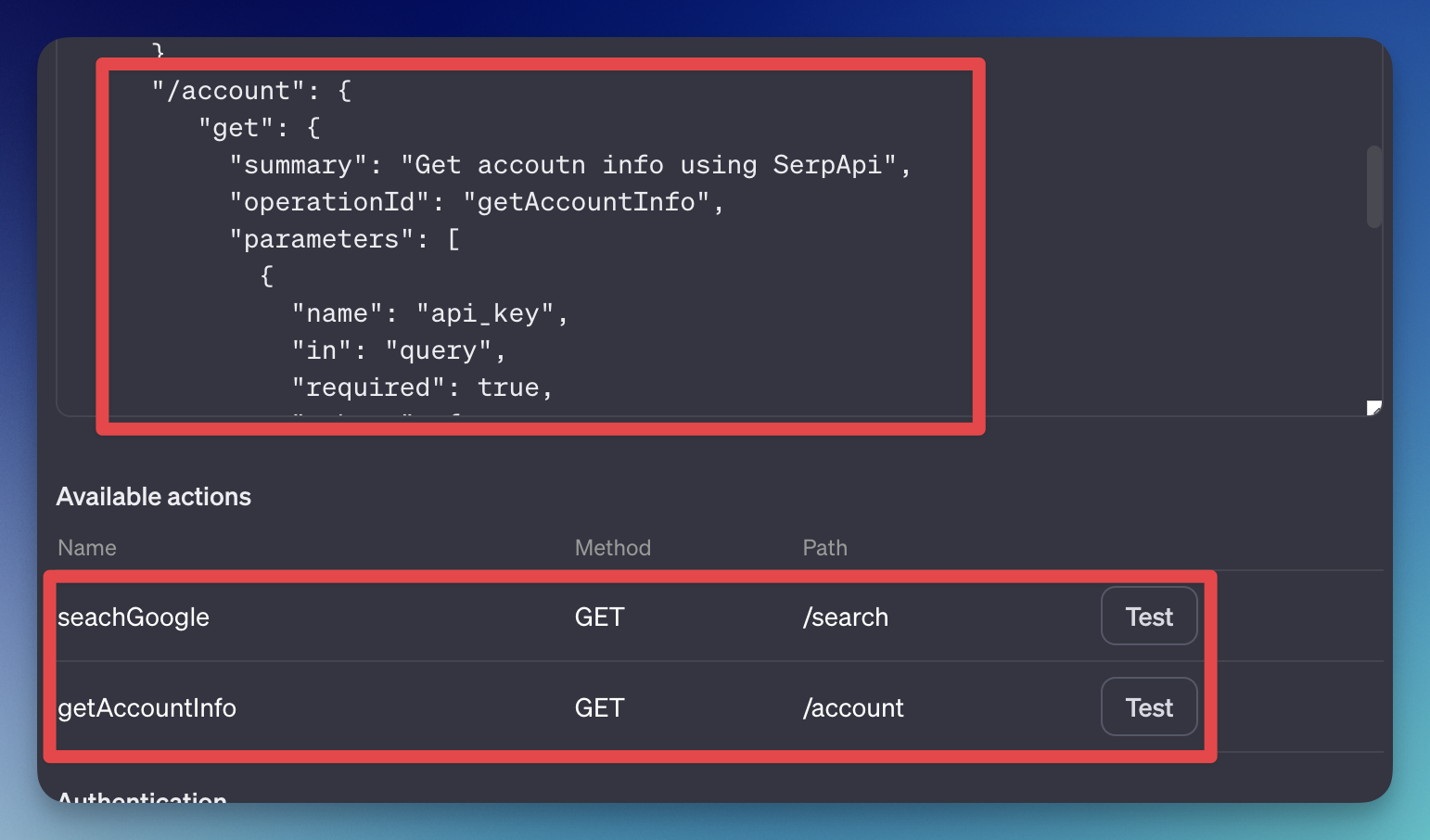 What if we have a different path? To simulate this, I'll add the "Account API" from SerpAPI, which retrieves the user account information. The endpoint is: https://serpapi.com/account?api_key=123