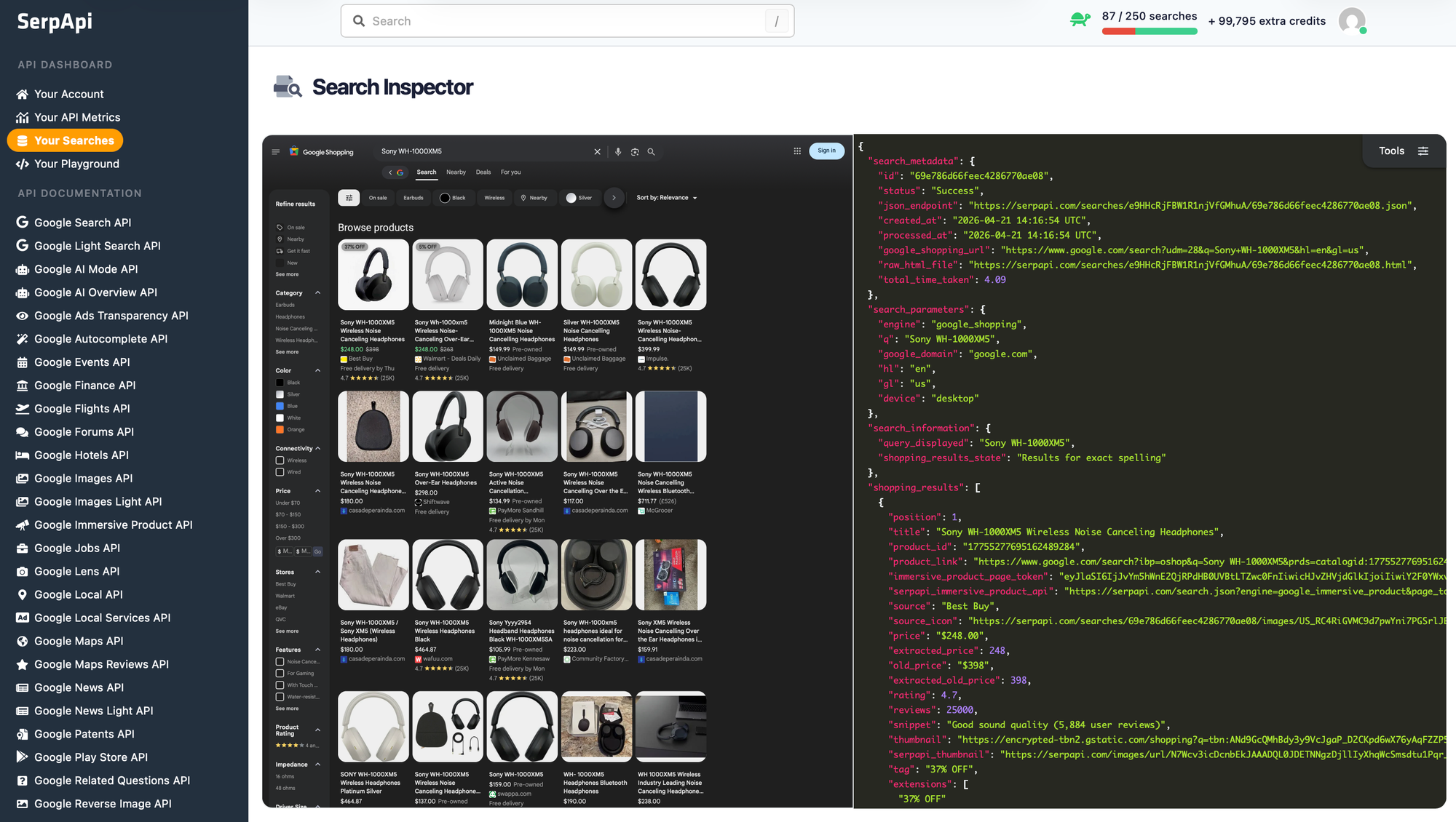 endIf we want to specifically recheck what search queries were run using SerpApi, we can head to serpapi.com/searches after logging in, and find the searches that were done. We'll get a full Search Inspector including the returned page and JSON: