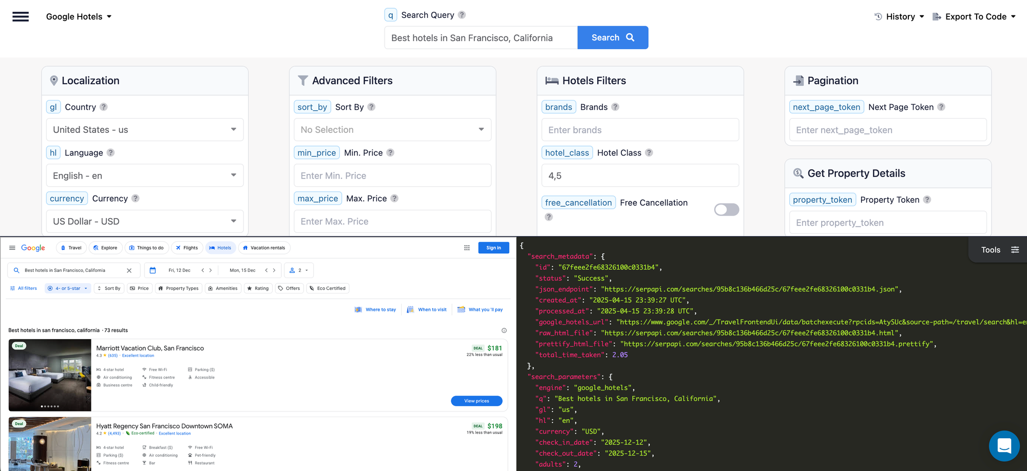 To find local hotels in a city, you can query our Google Hotels API, or still continue using our Google Maps API. Here I'll give an example using our Google Hotels API. I'm using the query "Best hotels in San Francisco, California" along with the hotel_class filter to get only 4 or 5 star hotels in the area. You can modify this as you need for your use case.