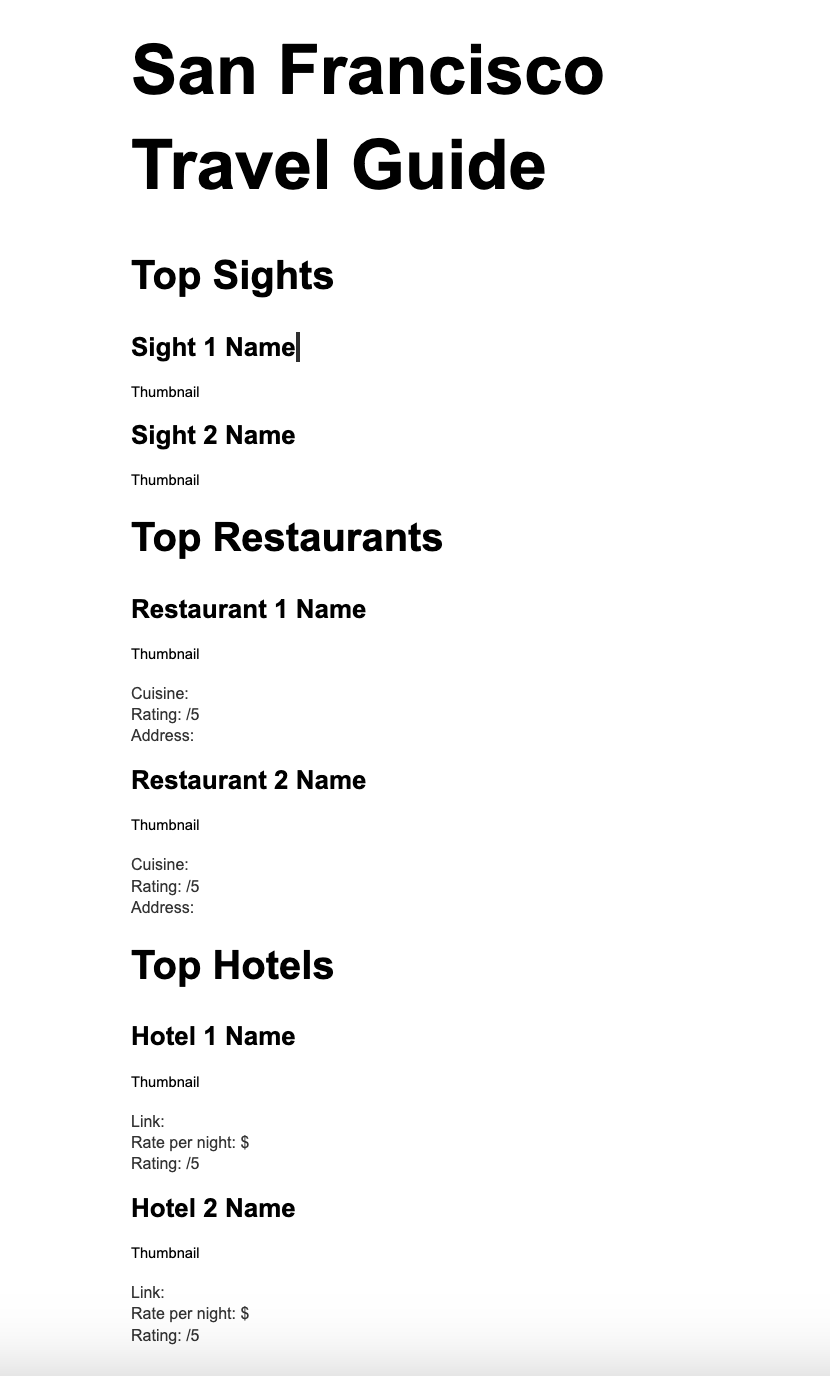 To build the guide with the data we have collected above, I'm going to use markdown. I'll keep the layout simple, but you can modify as needed for your use case. I created this simple layout for the travel guide: