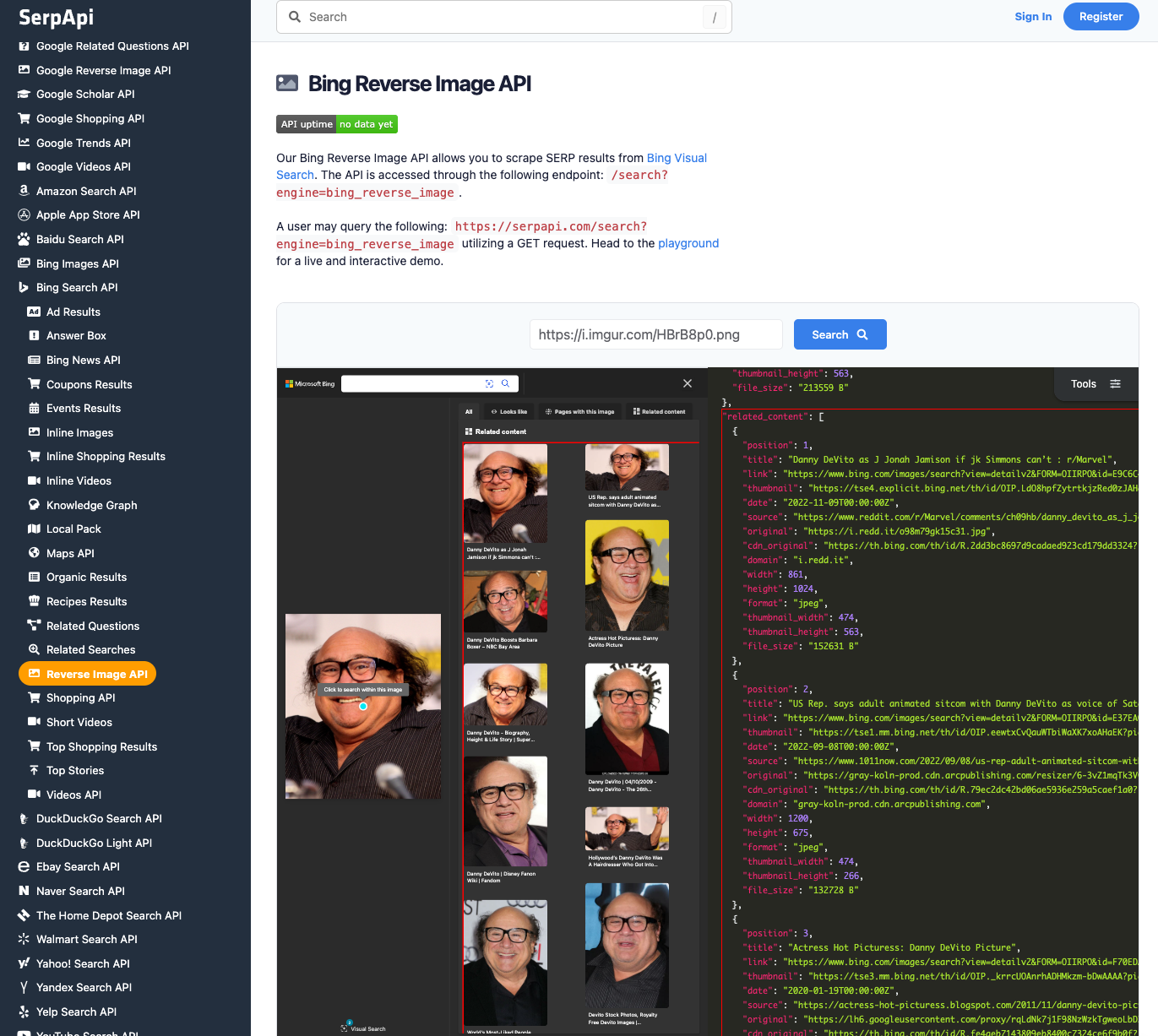 SerpApi can scrape all this data from Bing Visual Search with our Bing Reverse Image API . Like the Google and Yandex APIs, the Bing Reverse Image API is very easy to use.
