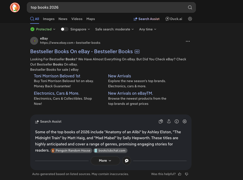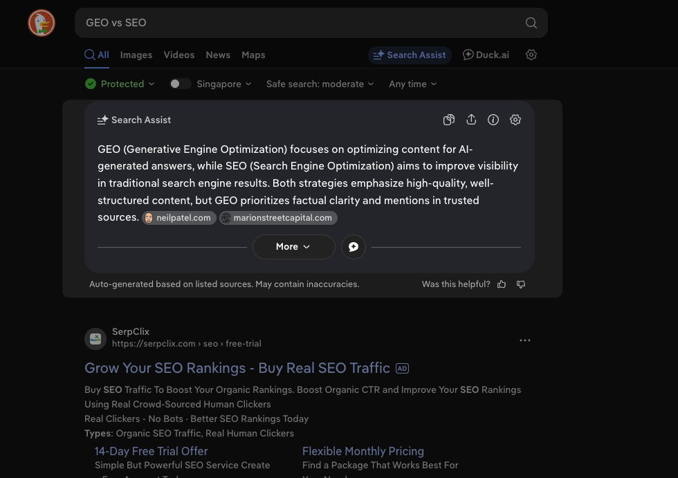 For example, DuckDuckGo offers "Search Assist" answer for visitors to find answers quickly: