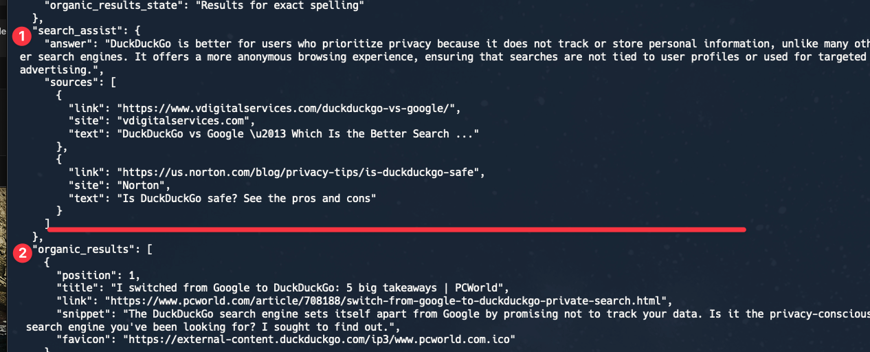 print(json.dumps(response, indent=2))You should see the search_assist answer before the organic_results