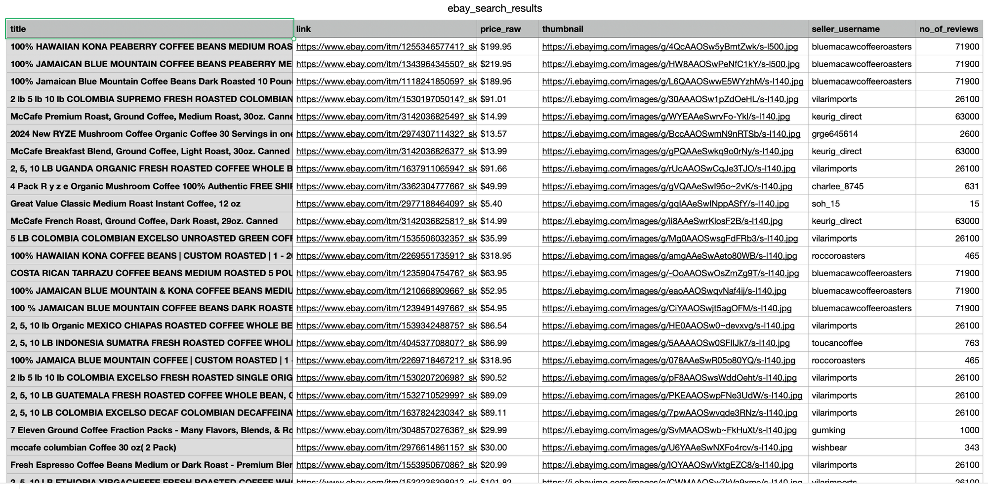 - Scrape eBay listings and prices from search results (titles, links, thumbnails, seller usernames, review counts, and more).