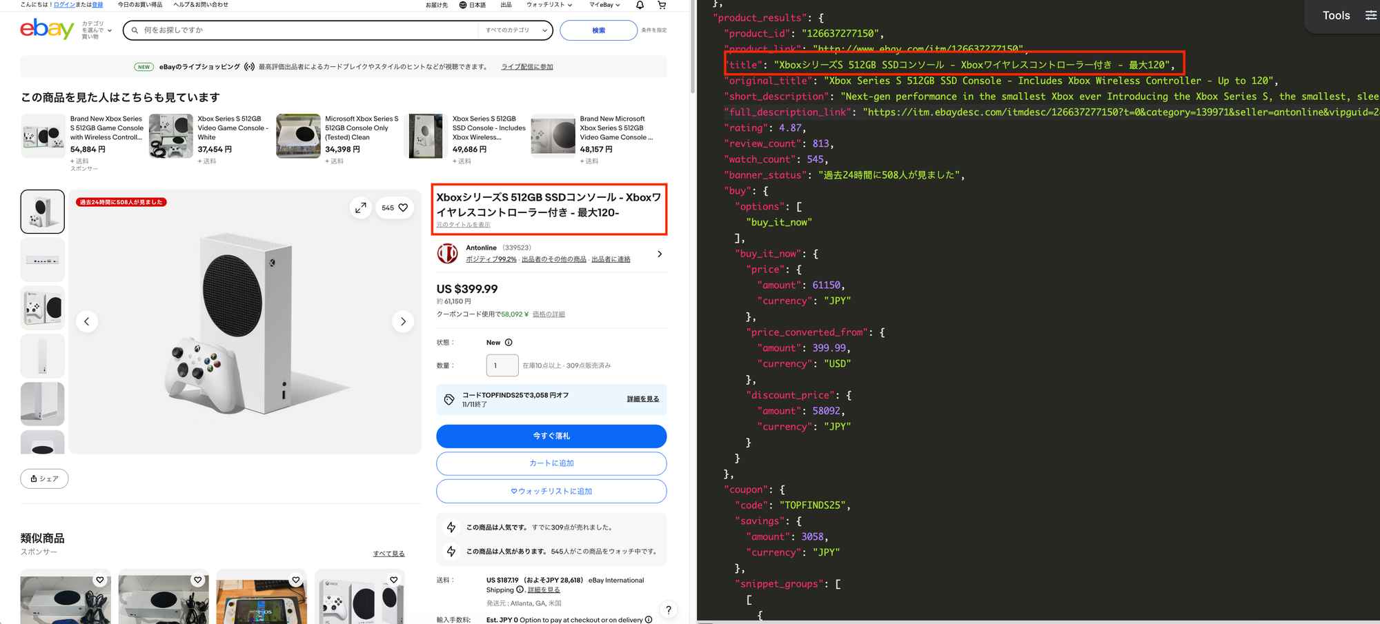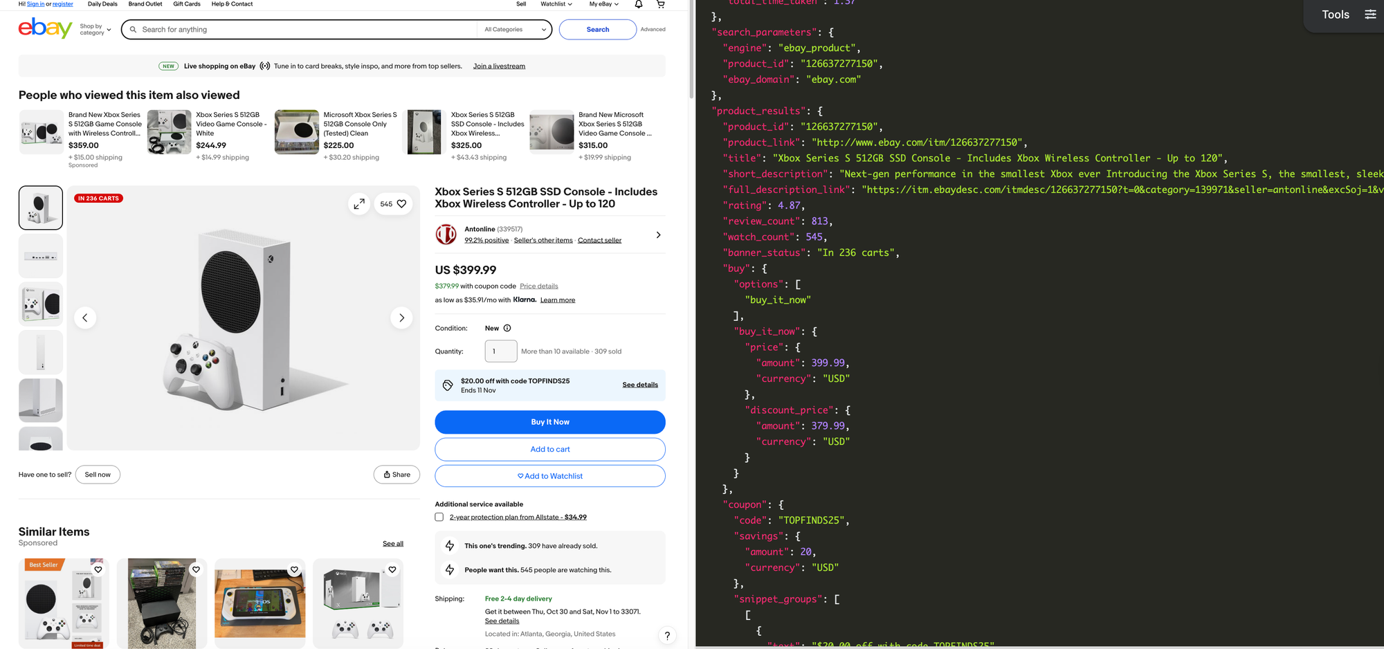 By combining the eBay Search API and Product API, you can scrape eBay product listings, extract eBay prices, and scrape eBay product reviews at scale without dealing with anti-bot challenges.