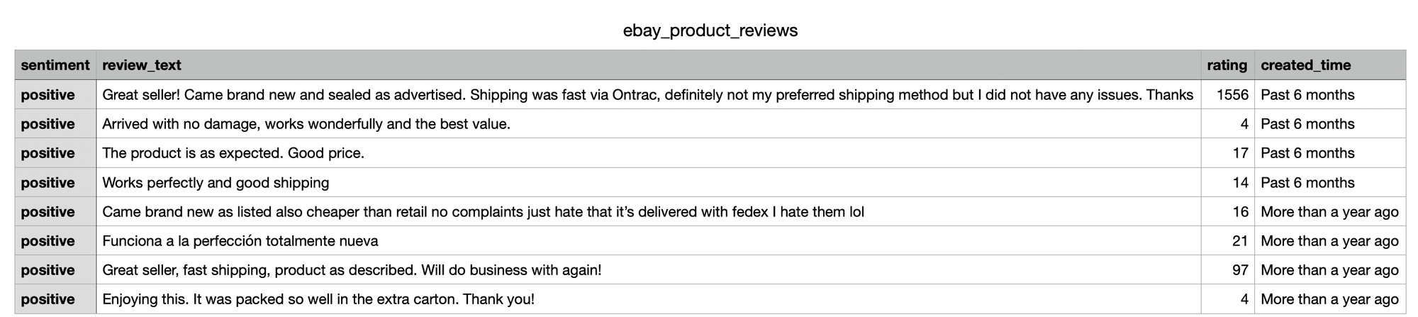 Beyond scraping eBay product listings and prices, many use cases require scraping eBay product reviews to gather customer sentiment insights.