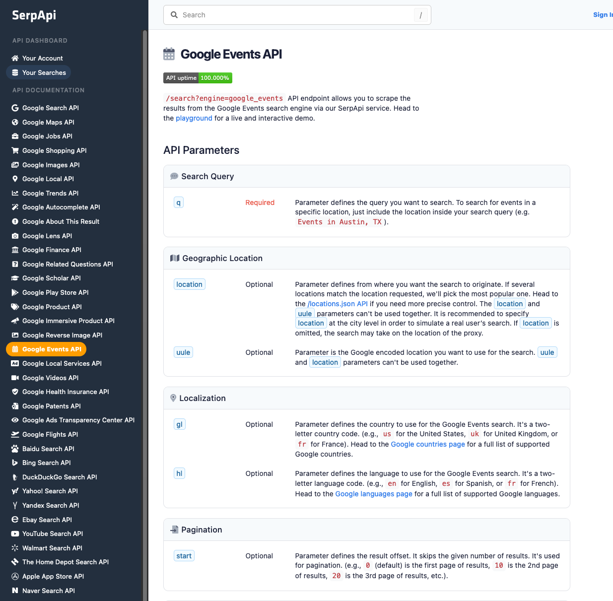 In this tutorial, we will scrape events results when searching with the "Events in Austin" keyword. The data contains: "title", "start_date", "when", "link", "description", "address" and more. You can also scrape more information with SerpApi.