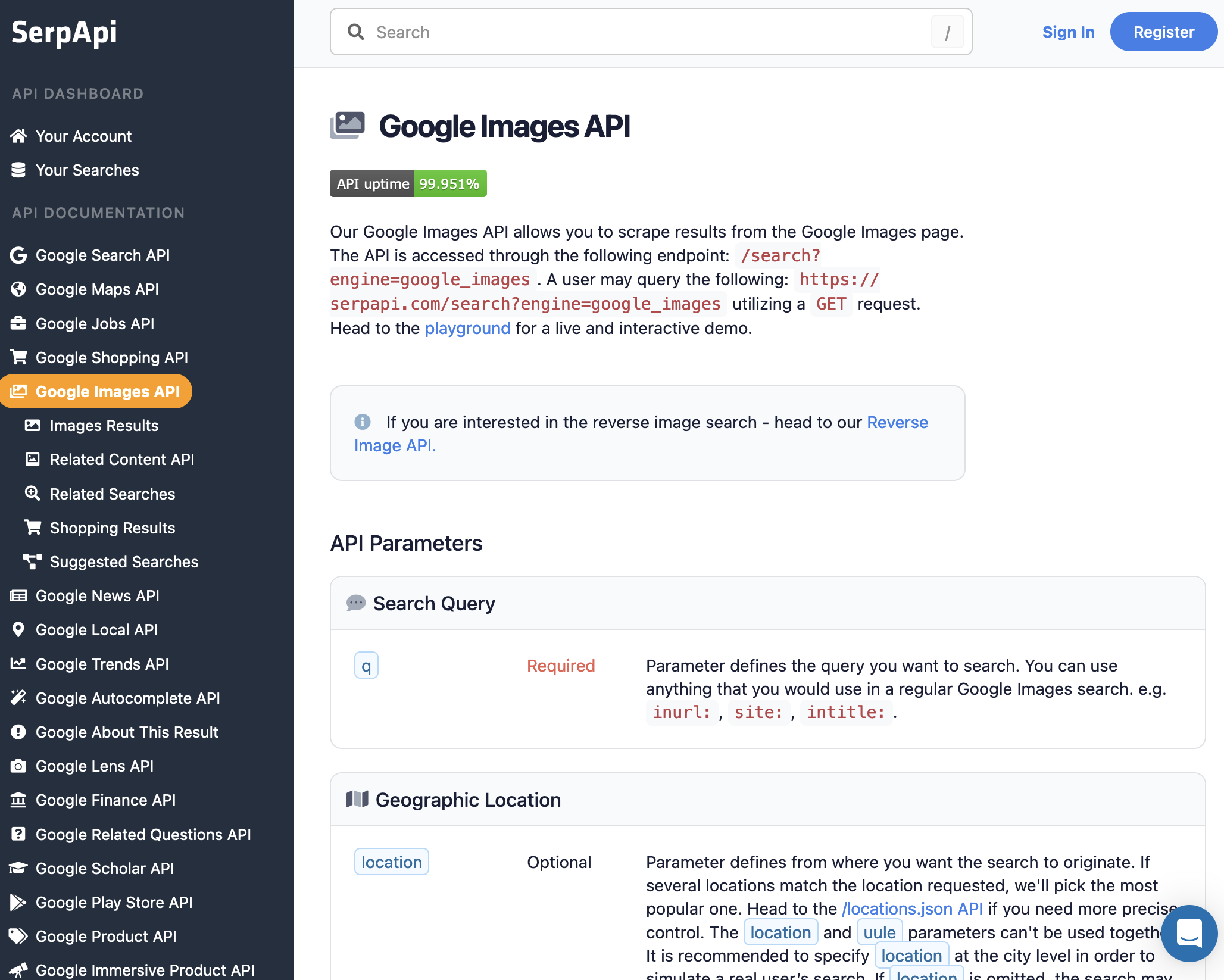Google Images is always an invaluable resource for your product. But scraping Google data is always tricky and challenging. By using our SerpApi, you don't need to worry about that. We support all available parameters like location, country, language, filters, and more.