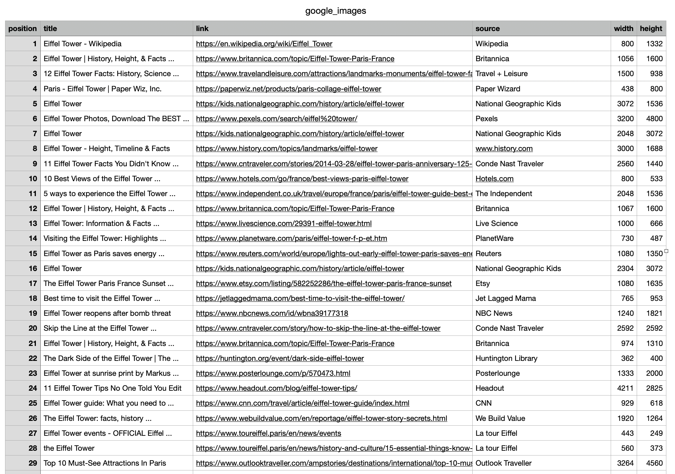 In this tutorial, we will scrape top images when searching with "Eiffel tower" keyword. The data contains: "position", "title", "link", "source", "width", "height", and more. You can also scrape more information with SerpApi.