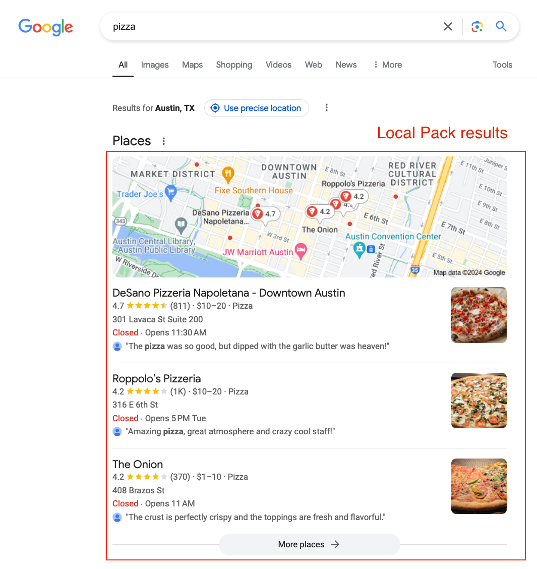 When you do a search, Google Local Pack results will be displayed on top of the search results. They will show the top 3 local businesses relevant to the search query. The Local Pack results will show the business name, address, phone number, hours of operation, and often user reviews.