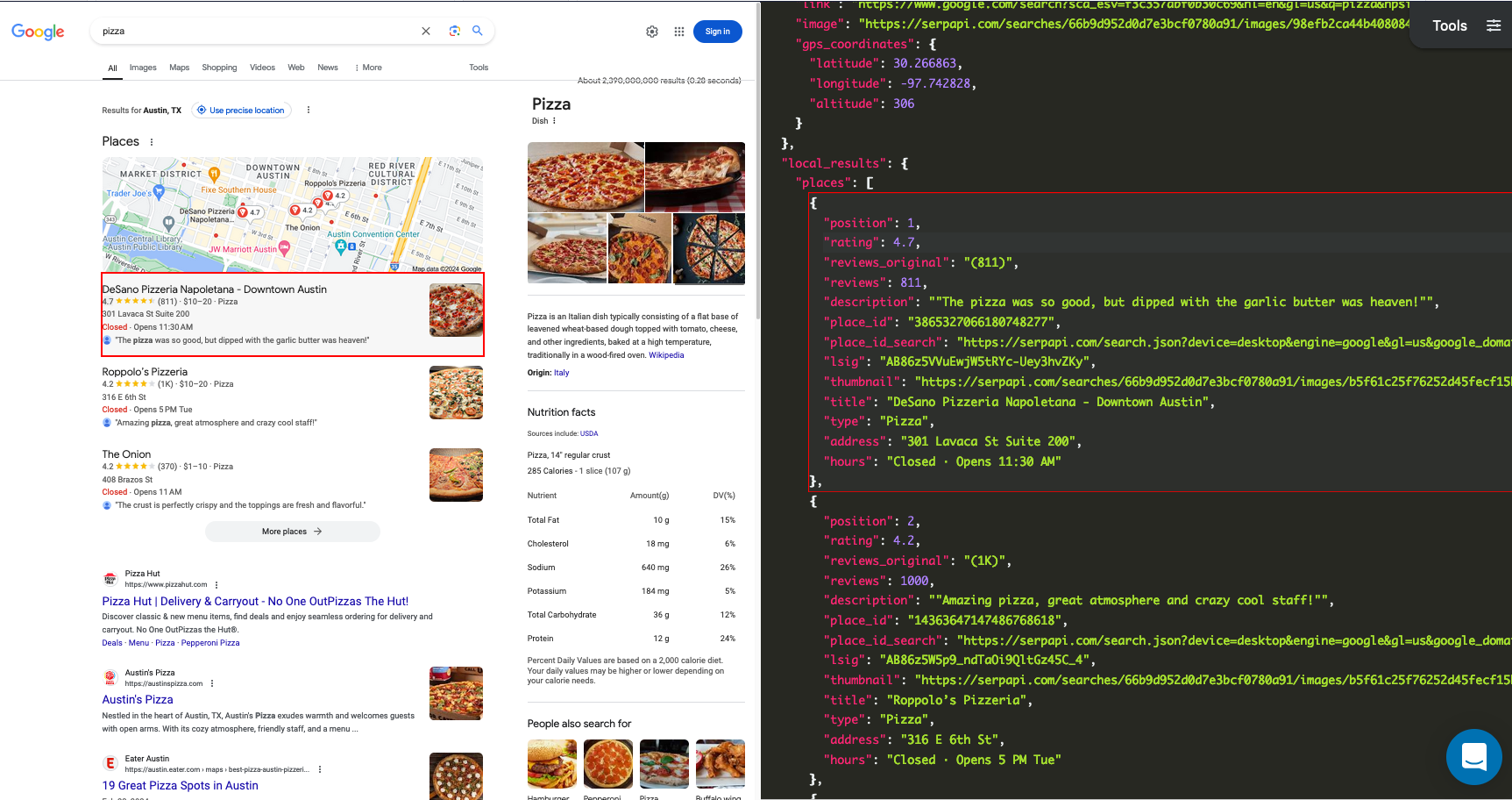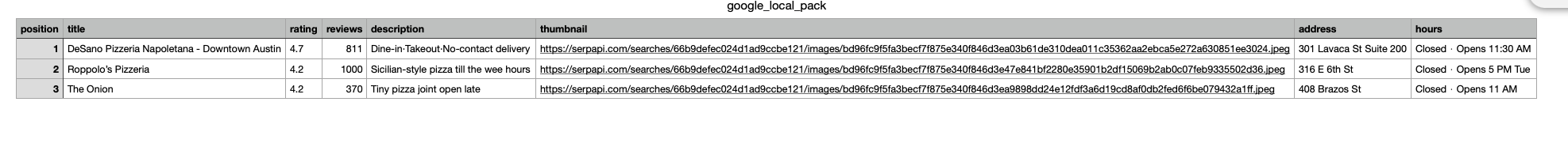 Let's find the top pizza stores in Austin. The data contains: "position", "title", "rating", "reviews", "description", "thumbnail", "address", "hours" and more. You can also scrape more information with SerpApi.