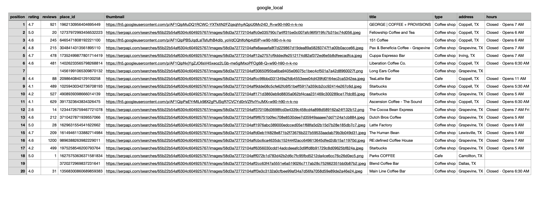 In this tutorial, we will scrape and extract the organic results for all "coffee" stores. The data contains: "position", "rating", "reviews", "place_id", "thumbnail", "title", "type", "address", "hours" and more. You can also scrape more information with SerpApi.