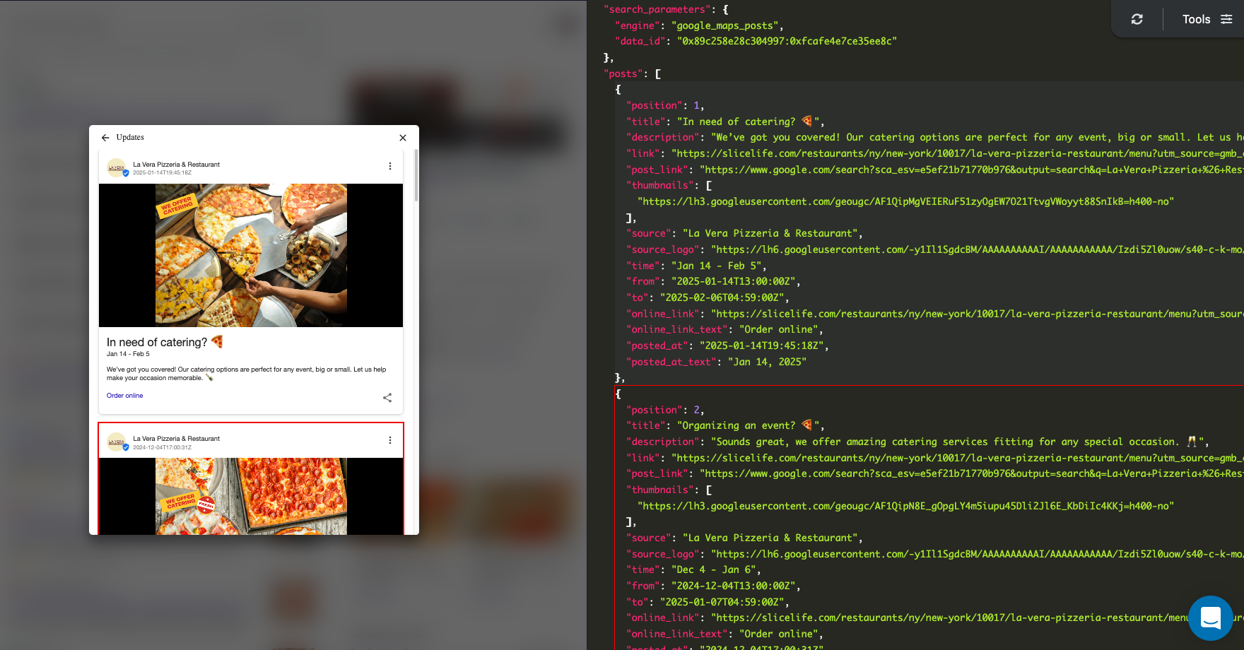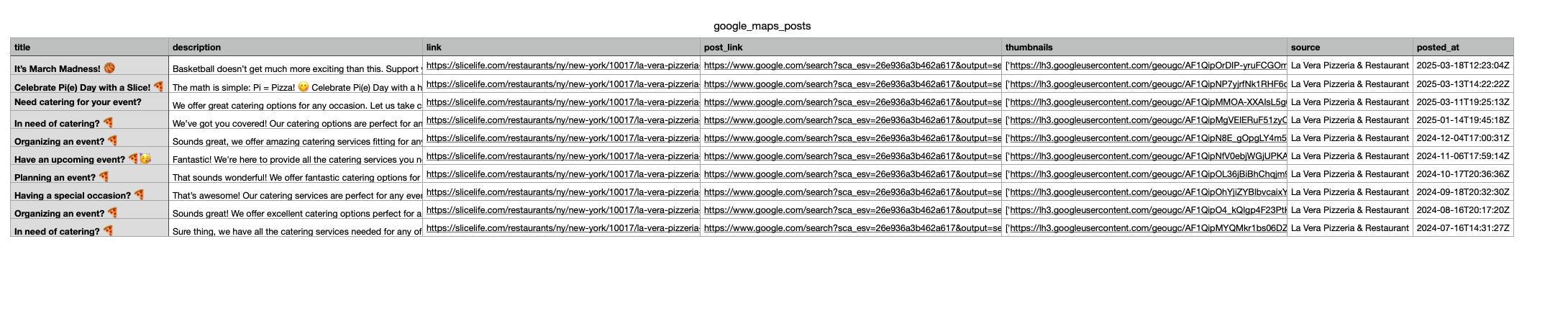 Let's collect posts from La Vera Pizzeria & Restaurant . The data contains: "title", "description", "link", "post_link", "thumbnails", "source", "posted_at" and more. You can also scrape more information with SerpApi.