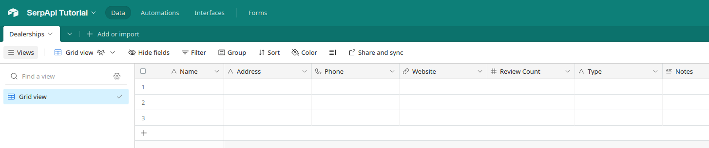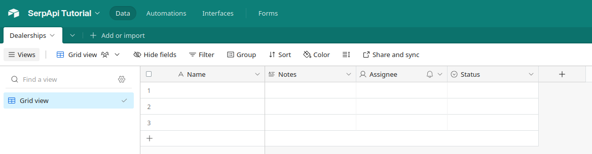 You should be taken to the Data tab of your new Base. You can optionally rename the Base and Table. I've set the Base name to SerpApi Tutorial and the Table to Dealerships.