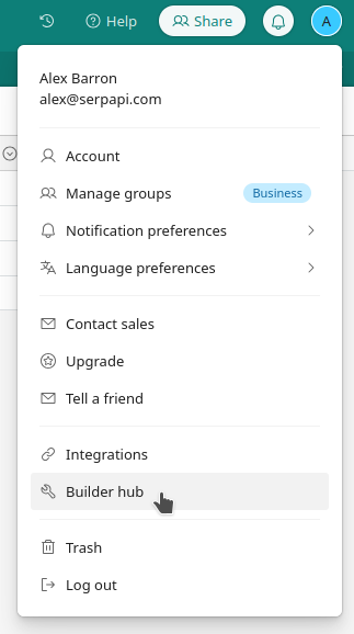 From the upper right menu with your first name initial, select "Builder hub".