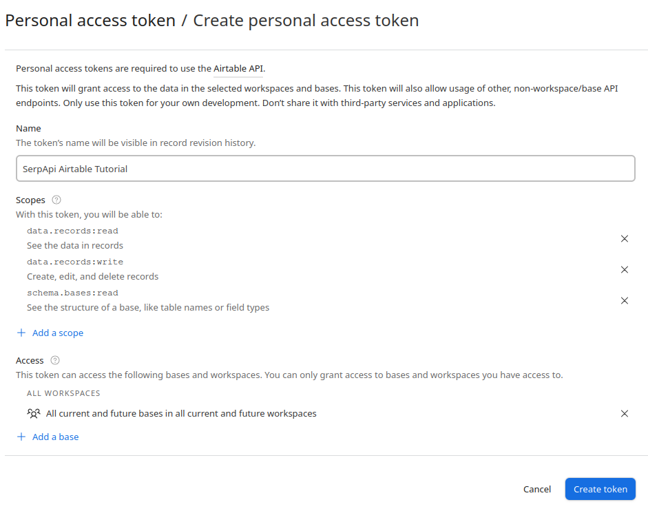 Since we'll be integrating Airtable into a Make Scenario, we also need to generate a Personal Access Token. This will allow Make to execute API calls against your Airtable instance.