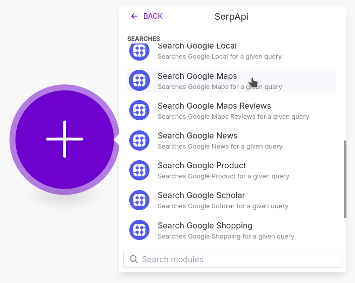 Start with a new Scenario and search for the SerpApi App. Select the Search Google Maps Module.