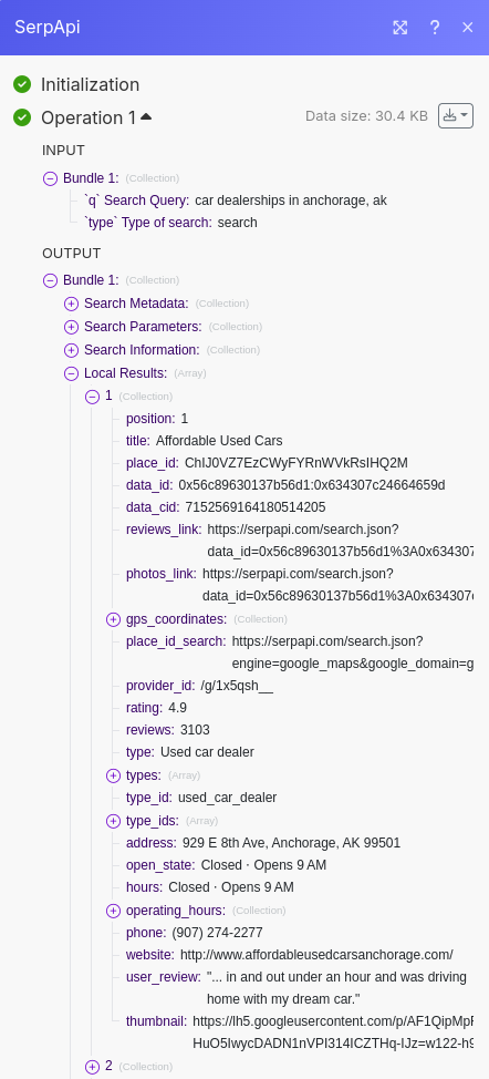Note that it will use a Make Operation for each car dealership result. To save Operations, I recommend stopping the Scenario after it searches a couple records so you don't use so many.
