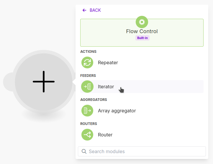 This Module will need to go at the beginning of our Scenario so we'll hit the "+" button at the bottom of the Scenario Editor to add an unlinked Module.