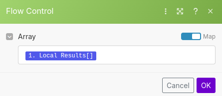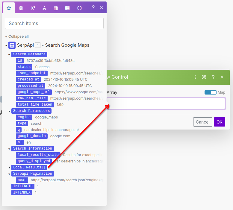 Click within the "Array" form box to show what fields are available for mapping. Click the blue Local Results[] element from the SerpApi Module.
