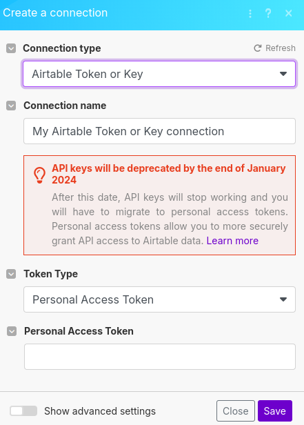 Select "Airtable Token or Key" and ensure "Token Type" is set to "Personal Access Token." Paste your token from the Airtable Setup Personal Access Token step and hit "Save".