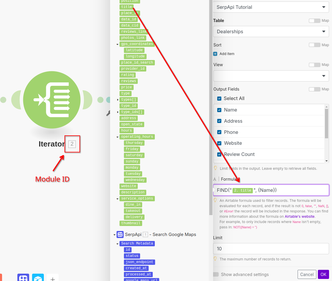 The first thing we can do is paginate through the Google Maps results to get more dealerships in the same market. You can do this by incrementing the Pagination Limit value in the SerpApi Module.