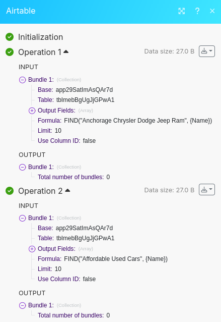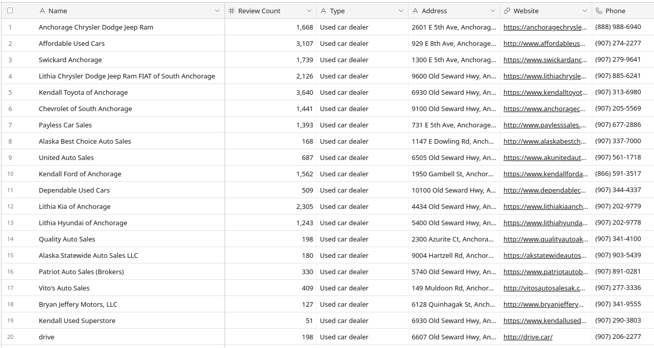 Finally, you can run the Scenario and you should see 20 car dealerships from Anchorage, AK show up in Airtable!