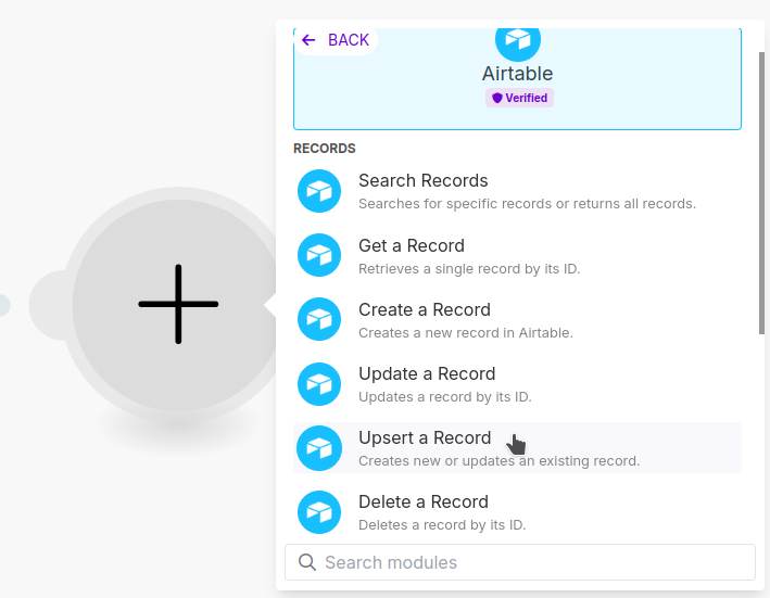 We'll be adding two Airtable Modules to our Scenario. The first will be to search for existing records in our Airtable database. The second will be to upsert the car dealership into Airtable. Upsert means insert the record if it's new or update it if it already exists.
