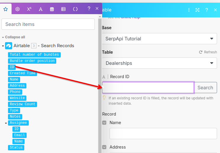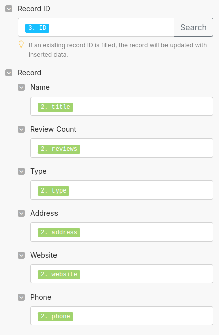 Using the Airtable Search Records Output, populate "Record ID" with ID. This will ensure the correct Airtable record is updated if it already exists. If it doesn't exist, there will be no ID present and will be created as a new record.