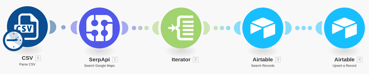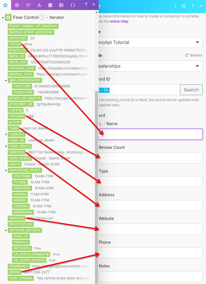 With that configured, we can run our Scenario again. The Scenario will loop through each city to find car dealerships through the Google Maps API and then upsert those records into Airtable.