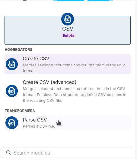 Search for csv and select the CSV App's Parse CSV Module. Make sure it's the CSV App, not EasyCSV.
