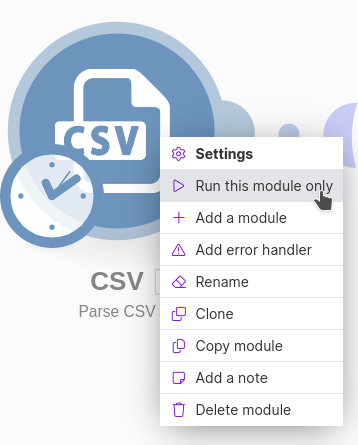Next, we need Make to recognize the output data of the CSV before we can reference it in other Modules. Click on the Module to get the pop-up menu and click "Run this module only".
