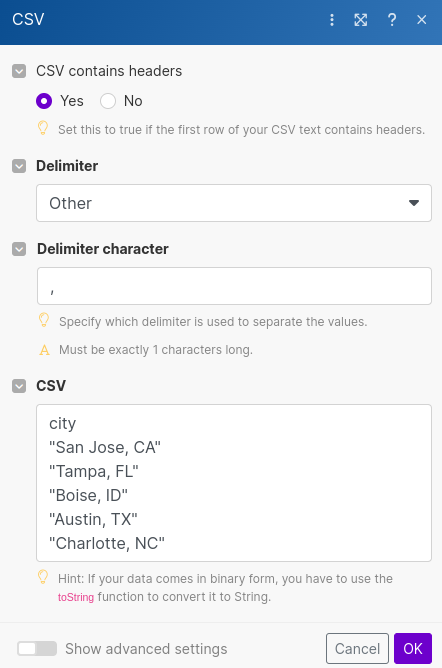 Since we're using American city names that generally are displayed with commas, you can either change the "Delimiter character" to something other than a comma or wrap quotes around the city names. I've opted for quotes.