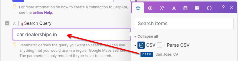 Then edit the SerpApi Module to replace anchorage, ak with the city field from the CSV Module.