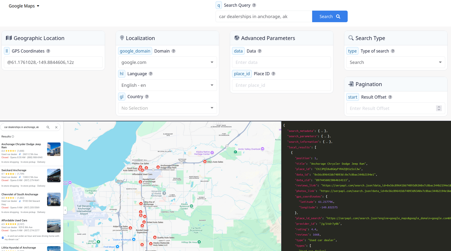 Using the SerpApi Playground, we can test out a query for car dealerships in achorage, ak. The JSON response body includes a local_results array containing a list of car dealerships in the Anchorage area.