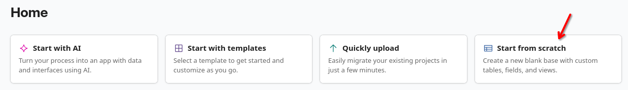 Create or log into your Airtable account. From the Home dashboard, create a new blank Base from scratch.
