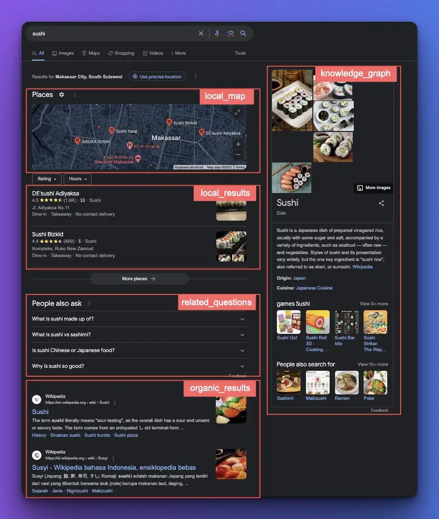 We can get all the information in Google results, not just the organic results list. For example, we can get the number of results, menu items, local results, related questions, knowledge graph, etc.