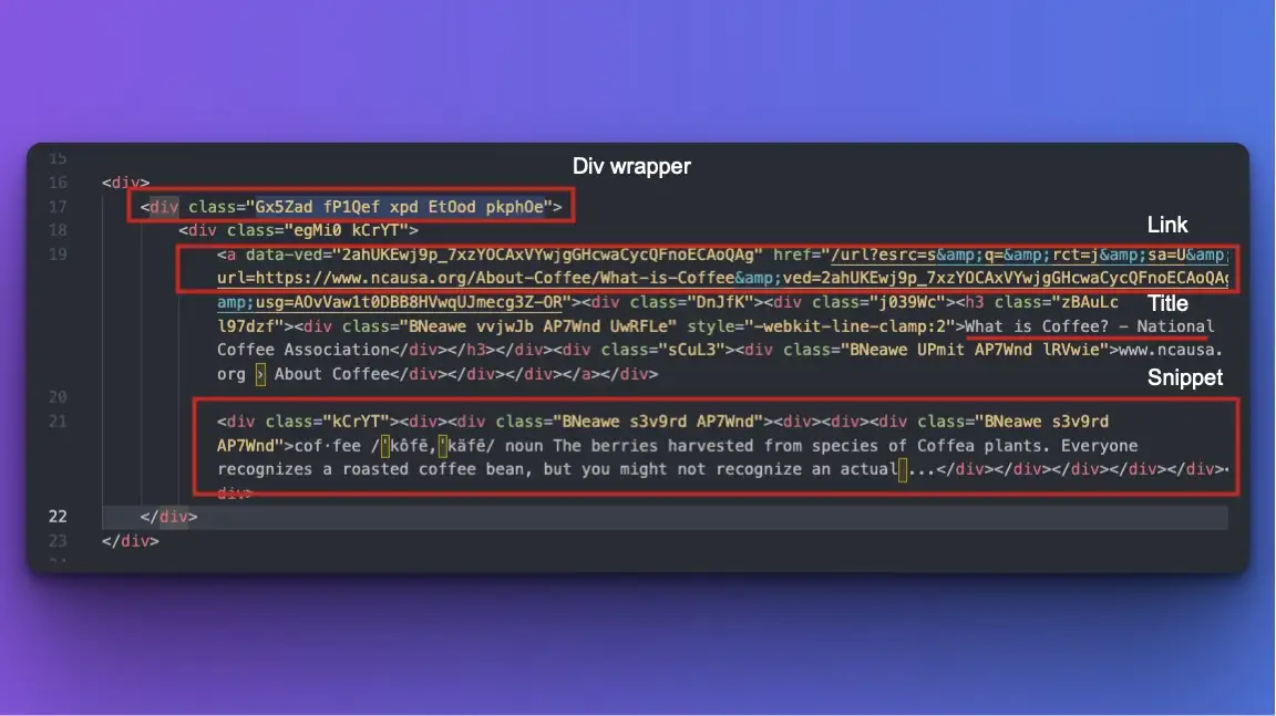 The results will show a raw HTML from Google SERP. Now, we should identify where the organic results are located. I'm doing this by copy-pasting the output to a text editor and trying to find a pattern.