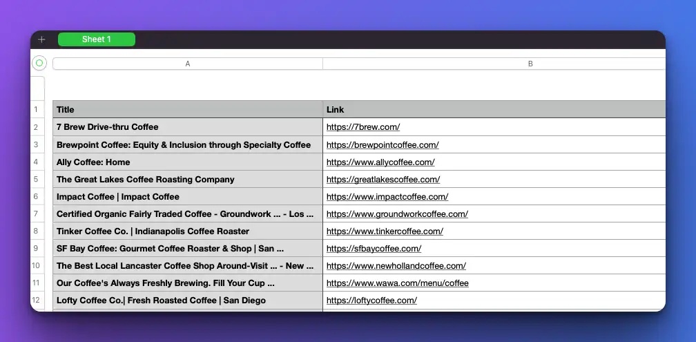 Now, you can view this data nicely by opening the output.csv file with Microsoft Excel or the Numbers application.