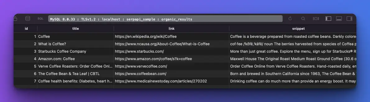 Now, let's learn how to save all this data in a database. We'll use mysql as an example here, but feel free to use another database engine as well. Like the previous sample, we'll store the title, link, and snippet from the organic results.