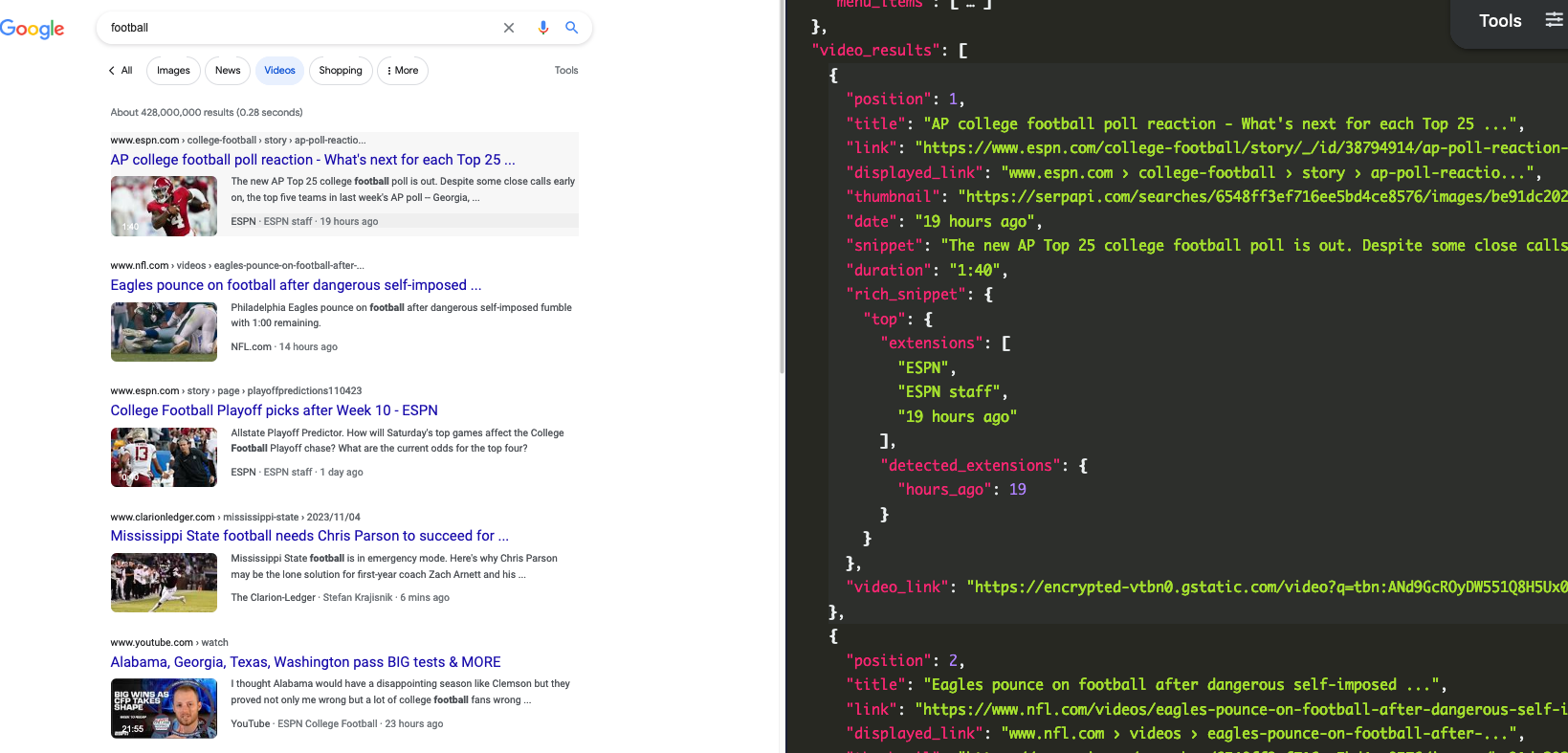 In this tutorial, we will scrape videos results when searching with the "football" keyword. The data contains: "position", "title", "link", "thumbnail", "description", "date", "duration" and more. You can also scrape more information with SerpApi.