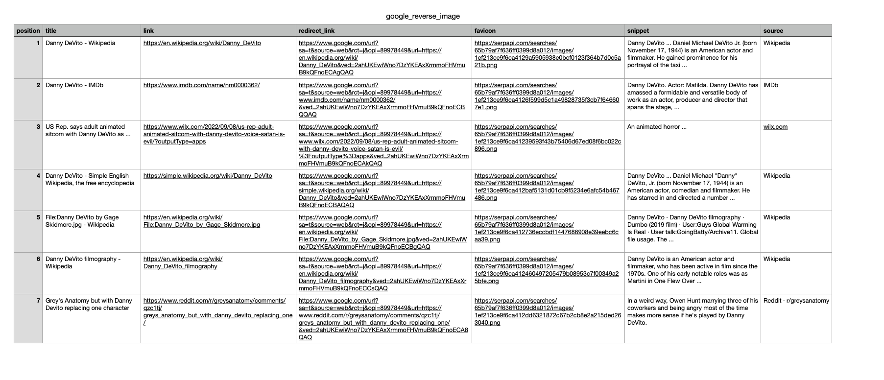 In this tutorial, we will scrape and extract all sources of the "Danny DeVito" image. The data contains: "position", "title", "link", "redirect_link", "favicon", "snippet", "source" and more. You can also scrape more information with SerpApi.