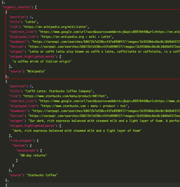 print(json.dumps(response, indent=2))Under the organic_results key, you can see all the organic results from Google SERP like this: