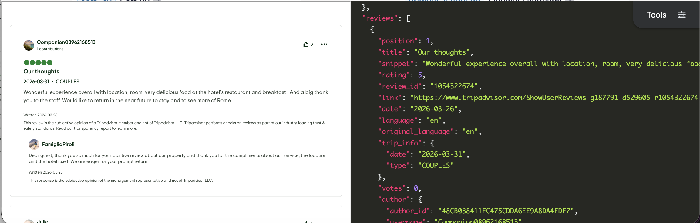 Now that we have collected a place_id value from the TripAdvisor Search API, we can take a look at the Tripadvisor Reviews API.