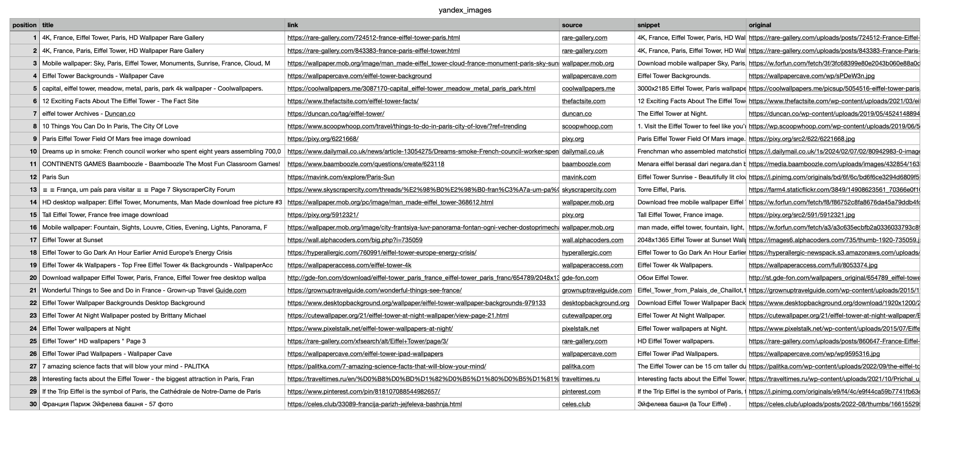 In this tutorial, we will scrape top images when searching with the "Eiffel tower" keyword. The data contains: "position", "title", "link", "source", "snippet", "original", and more. You can also scrape more information with SerpApi.
