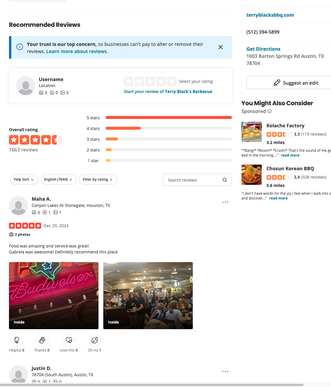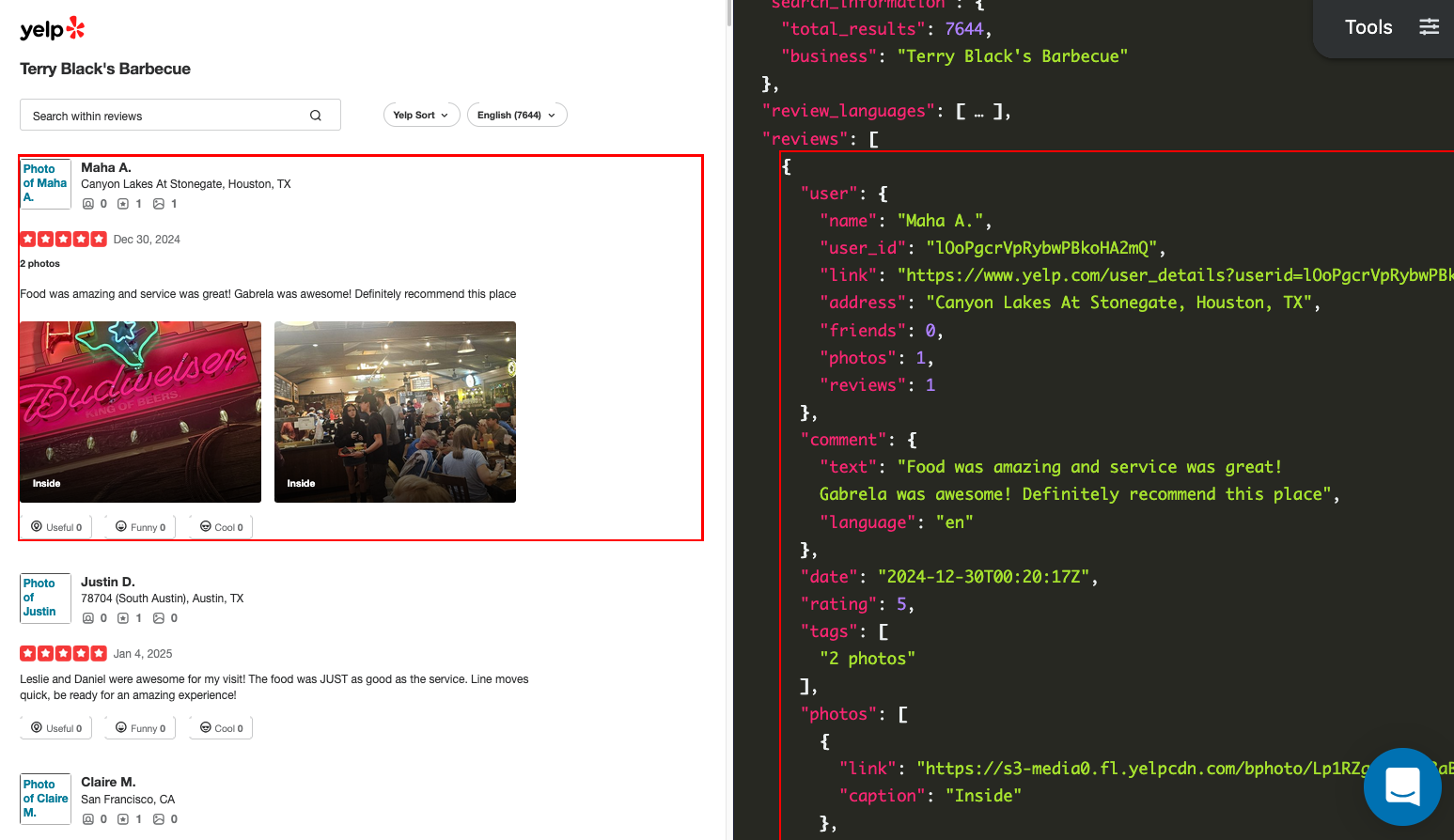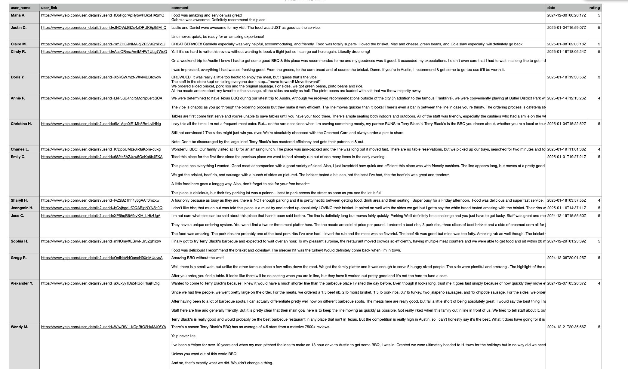 Let's collect all reviews for a top restaurant in Austin, Texas - Terry Black's Barbecue . The data contains: "user_name", "user_link", "comment", "date", "rating" and more. You can also scrape more information with SerpApi.
